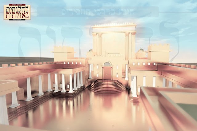 הלכה ז' – המנורה בדרום משמאל הנכנס ושולחן מימין שעליו לחם הפנים, ושניהם בצד קודש הקודשים מבחוץ ומזבח הקטורת משוך מבין שניהם לחוץ, ועושין בתוך העזרה גבולין עד כאן לישראל עד כאן לכהנים, ובונים בה בתים לשאר צרכי המקדש, כל בית מהם נקרא לשכה.