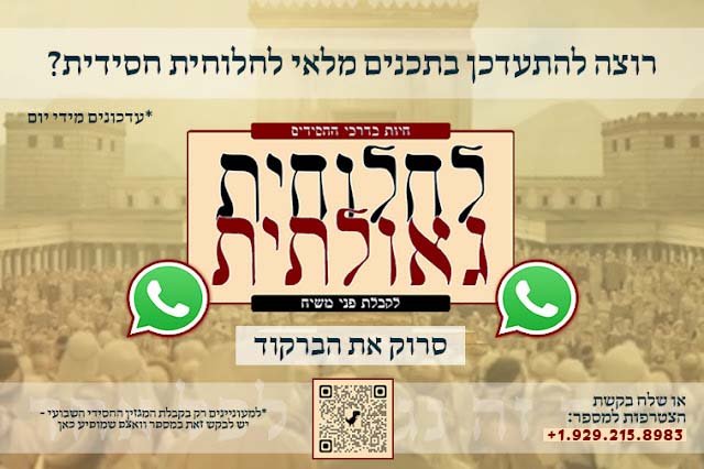 לכל המעוניין: נפתחה כעת קבוצת 'וואצפ' חדשה, עם אפשרות לקבלת כל עדכוני ותכני ארגון 'לחלוחית גאולתית' היישר למכשיר האישי מידי יום • ניתן להצטרף באמצעות שליחת בקשה למספר 1.929.215.8983+ או בסריקת הברקוד המצורף • הקליקו כאן והצטרפו לקבוצת העדכונים