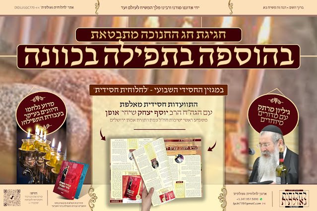 אגף ההוצאה לאור של ארגון 'לחלוחית גאולתית' לא חוסך מאמצים וכוח אדם, בכדי להביא לידכם את המגזין השבועי כמוצר מגומר בצורה האיכותית ביותר, ברוח ובחומר • לרגל חג החנוכה כלל מדורי העלון מנווטים בידי אמן בהקשר החגיגי, יחד עם התוועדות חסידית סוחפת עם המשפיע הנודע הרב יוסף יצחק אופן, שעומד בראש הוועד הרוחני של ארגון 'לחלוחית גאולתית', על מהותו של חג החנוכה לאור החסידות • לקריאת והורדת הגיליון המושקע