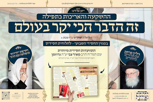 'הדבר היקר ביותר בעולם': ארגון 'לחלוחית גאולתית' מגיש את הגיליון השבועי, משולב בהתוועדות חסידית מיוחדת עם הגה"ח הרב מאיר צבי ('מונקע') ע"ה גרוזמן – ראש ישיבת תות"ל בכפר חב"ד, לרגל ה'יארצייט' בי"ז טבת • ההתוועדות עוסקת בנושא 'עבודת התפילה', עם 'יחידות' מיוחדת של הרבי עם הרב גרוזמן בעניין חשיבות התפילה באריכות בדורנו ועוד • להורדת הגיליון ולקריאה