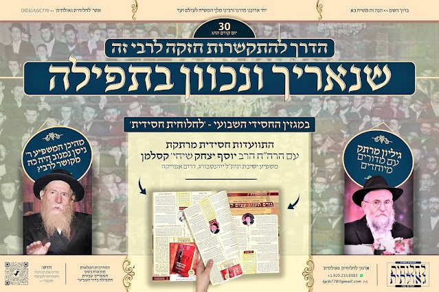 בעומדנו כשלושים יום קודם החג – יום הבהיר י' שבט, מערכת הגיליון השבועי 'לחלוחית חסידית' מגישה אותו לקהל הגולשים לקריאה והורדה • מהיכן שאב המשפיע ר' ניסן נמנוב ע"ה את החיות המיוחדת בהתקשרות לרבי? מה התשובה לתחושה שההשקעה בתפילה לא שינתה מאומה? • התוועדות חסידית מרתקת עם הרב יוסף יצחק קסלמן – משפיע בישיבת תות"ל יוהנסבורג שבדרום אפריקה • לקריאה והורדה