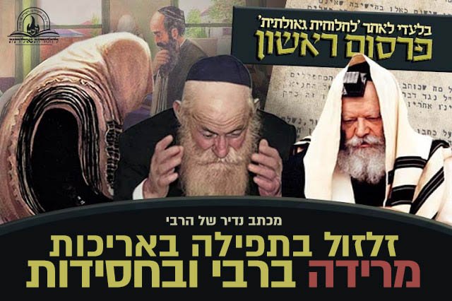 חשיפה לגולשי אתר 'לחלוחית גאולתית': אנו מגישים בפרסום ראשון מכתב מקורי של הרבי, שלא פורסם עד כה מעולם, מתאריך ז' תמוז תשכ"א (בהמשך למכתב נוסף מאותו חודש שפרסמנו באתרנו לראשונה) בו כותב הרבי בחריפות בצורה ברורה שאינה משתמעת לשני פנים, עד כמה מופרכת העובדה שישנם תלמידים בישיבת 'תומכי תמימים' בלוד אשר מתחצפים למשפיע הדגול הגה"ח ר' שלמה חיים קסלמן ע"ה, ובנוסף לזה גדלה חוצפתם של אלו שהם מזלזלים וצוחקים מהמתפללים באריכות כפי הדרכת המשפיע • בפנים: הרקע למכתב מהתקופה ההיא, יחד עם תשובתו הברורה של הרבי, גדושה בביטויים נדירים בחריפותם ולא שגרתיים כלל, שעניין אריכות התפילה נדרש ונחוץ בדורנו, ואלו שמזלזלים בזה הם 'מורדים' בדברי רבותינו נשיאנו • לסיפור המלא ולצילום המכתב