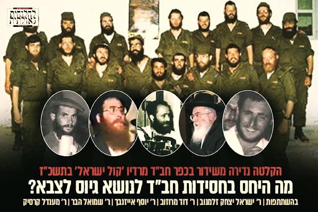 מה היחס בחסידות חב"ד לנושא גיוס לצבא? כבר בשנת תשכ"ז, הגיע צוות מרדיו 'קול ישראל' ליום שידורים מיוחד בכפר חב"ד, והתמקם בביתו של ר' יצחק גנזבורג ע"ה • במהלך הראיון נשאלו בחורי הישיבה 'האם אתם מתכננים לשרת בצבא?', וענו כל אחד בדרכו הוא. בין המרואיינים היו גם אברכים ששירתו בצבא ולחמו ב'מבצע קדש' ומלחמת ששת הימים • בין המשתתפים בראיון: ר' ישראל יצחק זלמנוב, ר' יוסף אייזנבך, ר' שמואל הבר, ר' מענדל קרסיק ע"ה. האיש עלום השם בראיון המוקלט: ר' דוד מרוזוב הי"ד שנפל אחרי מספר חודשים בתום מלחמת 'ששת הימים' על גדות תעלת סואץ • צוות ארגון 'לחלוחית גאולתית' מגיש את ההקלטה הנדירה להאזנה – אל תפספסו • האזינו