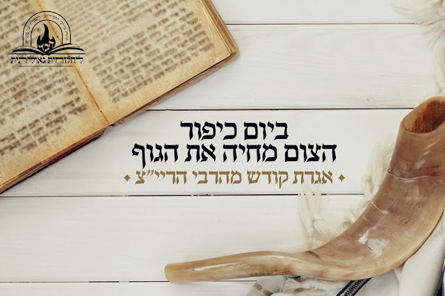 אנו מגישים אגרת קודש מיוחדת של הרבי הריי"צ בקשר לצום יום הכיפורים • צום הכיפורים, הצום עצמו מחיה מזין ומפרנס את הגוף, וכמו שכתוב 'ולהחיותם ברעב', דהרעב עצמו הוא החיות, וביום כפור הוא בדרך מתנה מלמעלה, מתנה מאין סוף.. לעצום עיניו, לאטום אזניו שלא להיות כלי קיבול לדברים לא טובים, ומי יאמר חס ושלום רעים. ולהיזהר בדיבור' • לקריאה