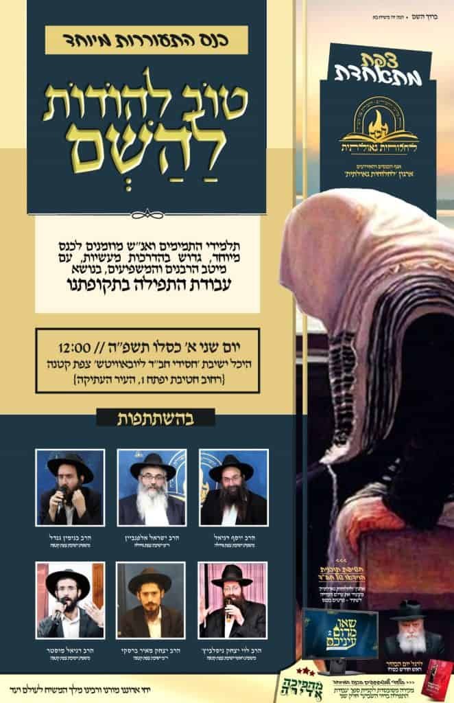 לרגל יום הבהיר ראש חודש כסלו, אגף האירועים של ארגון 'לחלוחית גאולתית' עורך כנס התעוררות מיוחד עם הסלוגן 'טוב להודות להשם', בנושא 'עבודת התפילה' בתקופתנו רגע לפני הגאולה, עבור תלמידי התמימים ואנ"ש בצפת. במהלך הכנס תחשף תוכנית וידאו מיוחדת של הארגון ותתקיים מכירה מסובסדת לקניית חלק שני מסט הספרים 'עבודת התפילה בדור השביעי' • הכנס יתקיים בהיכל ישיבת 'חסידי חב"ד ליובאוויטש' קטנה בצפת (רחוב חטיבת יפתח 1, העיר העתיקה), ביום שני א' כסלו תשפ"ה בשעה 12:00 • ישתתפו המשפיעים: הרב ישראל אלפנביין, הרב יוסף דניאל, הרב לוי יצחק ניסלביץ', הרב בנימין זאב גנדל, הרב נחמיה גרייזמאן והרב דניאל מוסטר • למודעה המלאה עם כל הפרטים