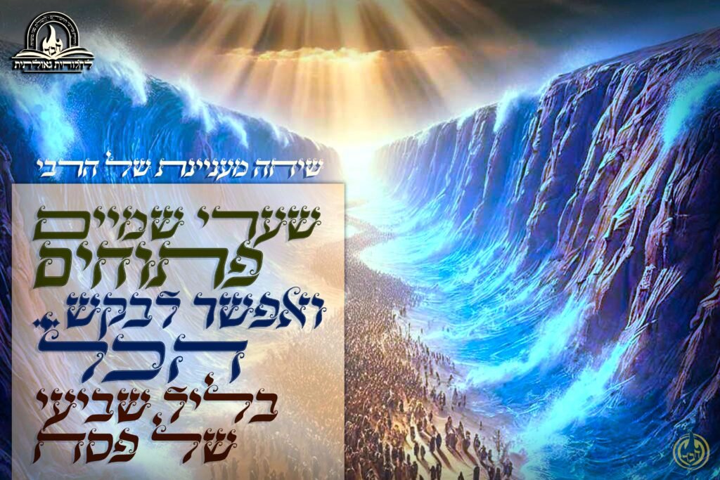 אנו מגישים שיחה מעניינת של הרבי מליל 'שביעי של פסח' תשכ"ט, בנוגע למנהג להישאר ערים בלילה זה, קריאת 'שיר השירים', הידור לקדש והזמן לבקשת ברכות מהקדוש ברוך הוא • 'הענין שמצינו שבליל שביעי של פסח שערי שמים פתוחים, ואמר הרבי שליט"א, שלא עומדים שומרים אצל השערים, ולכן יכול כל אחד מישראל לבקש ולפעול הכל ('אַלץ אויסבעטן')' • לשיחה המלאה