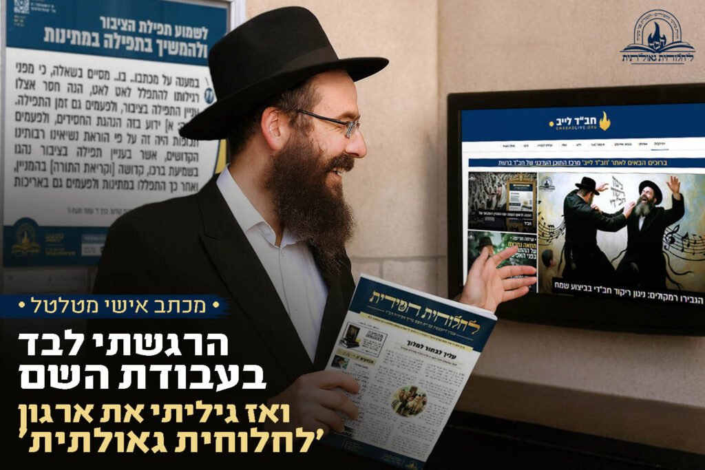 אתם מוכרים לי כבר כמה שנים. בפעם הראשונה נחשפתי אליכם כשהגעתי ל־770, ושמחתי עד מאוד לראות שלטים – לא סתם מודעות ודברים חיצוניים – אלא קריאות להתעוררות בעבודה פנימית, בעבודת התפילה! אבל רק לפני כמה שבועות פגשתי את האתר החדש שלכם – אתר 'חב"ד לייב'. זה ממש מחיֵּה נפשות – לקרוא, להאזין ולראות את כל התוכן על 'עבודת התפילה'.
