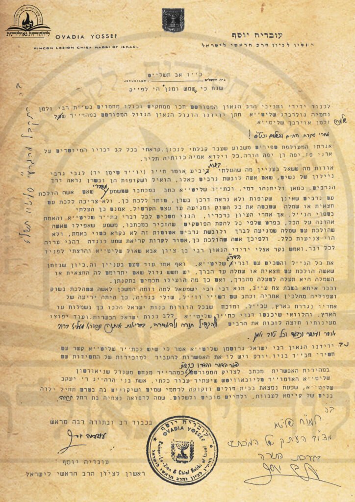 לפניכם מכתב מיוחד בו מבקש הגאון הרב עובדיה יוסף ע"ה מידידו הגאון הרב זלמן נחמיה גולדברג ע"ה (בסוף מכתב הלכתי), להשתמש בקשרים שיש לו בחסידות חב"ד, על מנת לקבל ברכת 'רפואה שלמה' מהרבי עבור כלתו, המאושפזת בבית הרפואה.