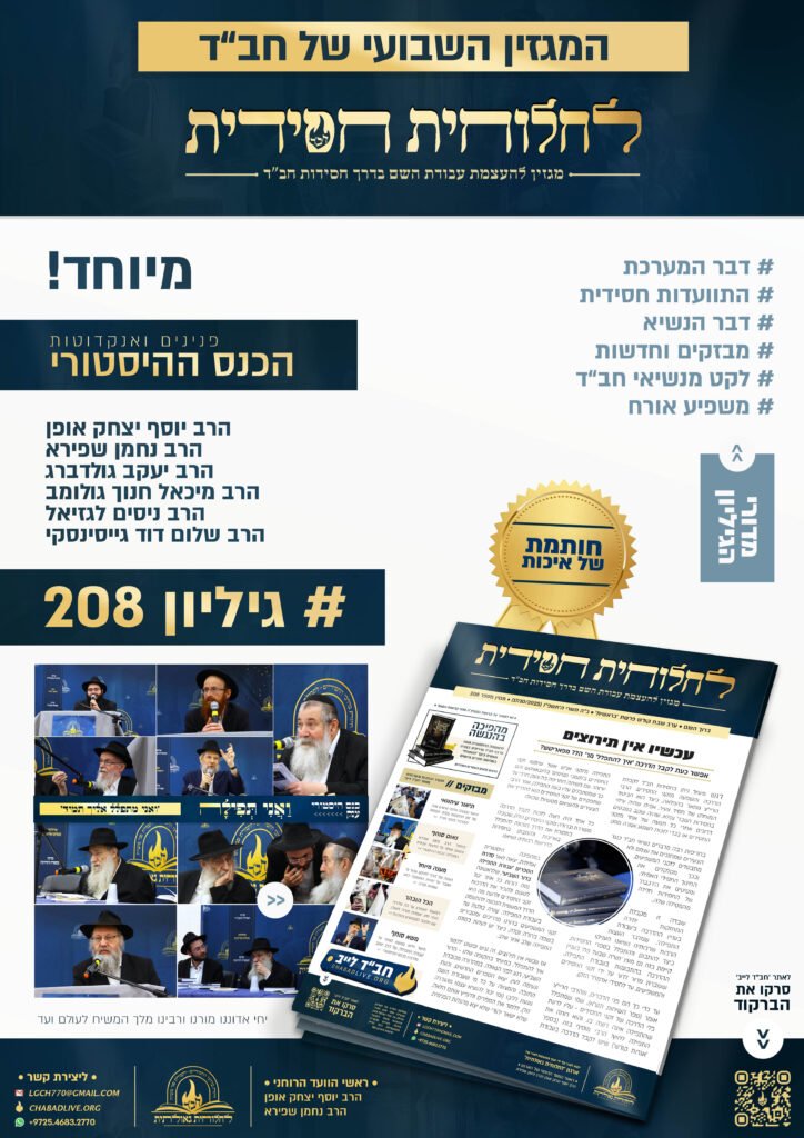 אגף ההוצאה לאור של ארגון 'לחלוחית גאולתית' שמח להגיש את מגזין 'לחלוחית חסידית' מספר 208, שנועד להעצים את עבודת השם בדרך חסידות חב"ד – בשפה פשוטה, שווה לכל נפש. המגזין מופק בעיצוב מתקדם ונעים לקריאה, וכולל תוכן חסידי עשיר, מאמרי דעה אקטואליים, וכתבות מרתקות שמחברות את הקורא לעולם החסידות בצורה חיה ומרגשת • בין המדורים במגזין המחודש: דבר המערכת, דבר הנשיא, מבזקים וחדשות, לקט מנשיאי חב”ד, משפיע אורח • במרכז המגזין ישנם אנקדוטות ופנינים נוספים (בהמשך למגזין שפרסמנו) מהכנס ההיסטורי 'ואני תפילה' תשפ"ו, בהשתתפות: הרב יוסף יצחק אופן, הרב נחמן שפירא, הרב יעקב גולדברג, הרב מיכאל גולומב, הרב ניסים לגזיאל והרב שלום דוד גייסינסקי • בפנים: המגזין זמין לקריאה ולהורדה, כולל מודעה לפרסום הגיליון • לכתבה המלאה