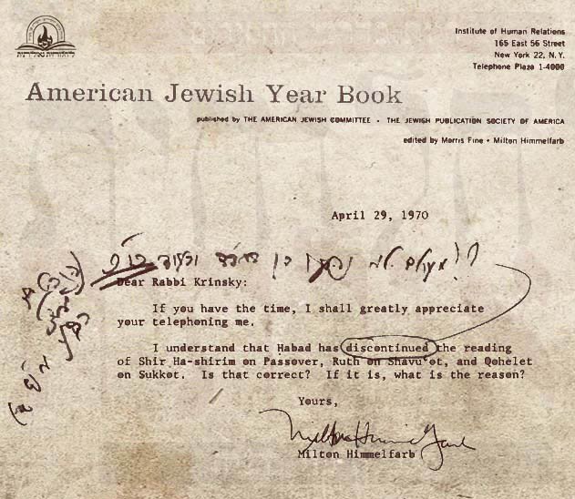 אנו מגישים כתב יד קודש ממענה הרבי על מכתב שאלה מעורך מגזין ה'אמריקן ג'ואיש יירבוק' – מר מילטאן הימלפרב, בו הוא שואל באנגלית האם נכון שחב"ד הפסיקו את המנהג לקרוא את מגילת 'שיר השירים' בחג הפסח, את 'מגילת רות' בחג השבועות ואת 'מגילת קהלת' בסוכות, ושואל את הטעם לכך.