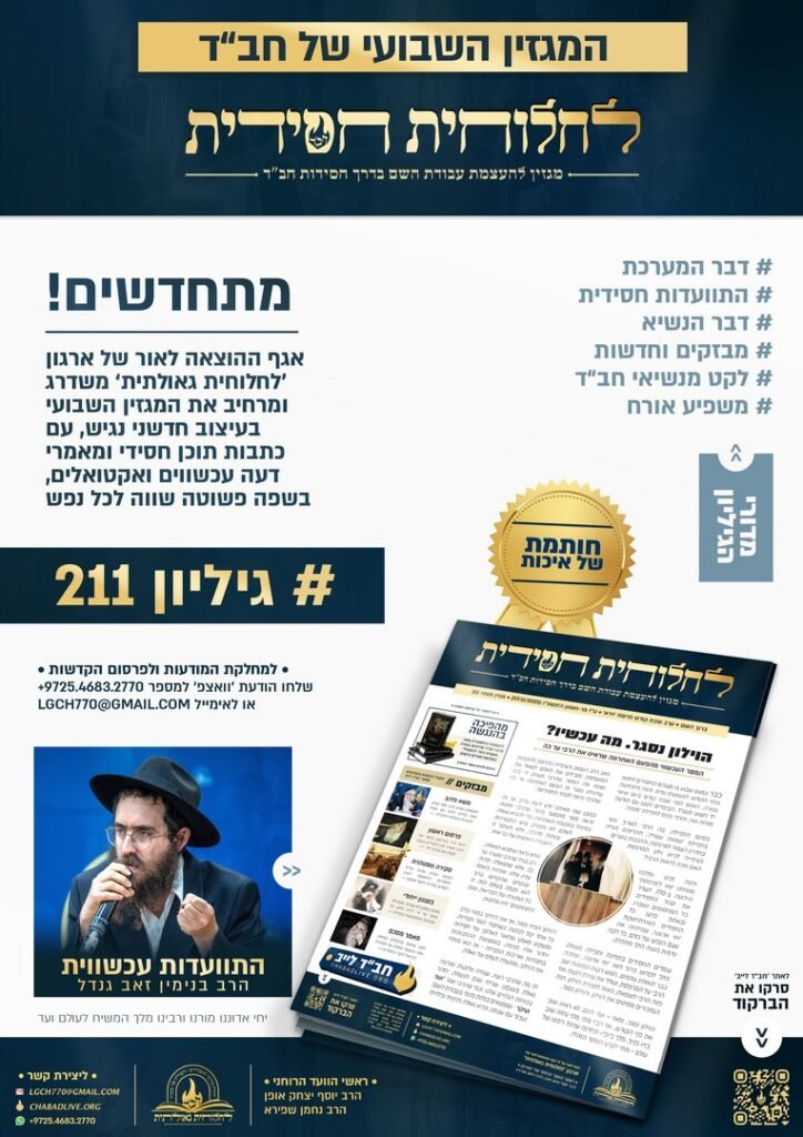 אגף ההוצאה לאור של ארגון 'לחלוחית גאולתית' שמח להגיש את מגזין 'לחלוחית חסידית' מספר 211, שנועד להעצים את עבודת השם בדרך חסידות חב"ד – בשפה פשוטה, שווה לכל נפש. המגזין מופק בעיצוב מתקדם ונעים לקריאה, וכולל תוכן חסידי עשיר, מאמרי דעה אקטואליים, וכתבות מרתקות שמחברות את הקורא לעולם החסידות בצורה חיה ומרגשת • בין המדורים במגזין המחודש: דבר המערכת, דבר הנשיא, מבזקים וחדשות, לקט מנשיאי חב”ד, משפיע אורח • במרכז המגזין התוועדות חסידית מיוחדת עם הרב בנימין זאב גנדל – משפיע ישיבת חח"ל צפת • בפנים: המגזין זמין לקריאה ולהורדה, כולל מודעה לפרסום הגיליון • לכתבה המלאה