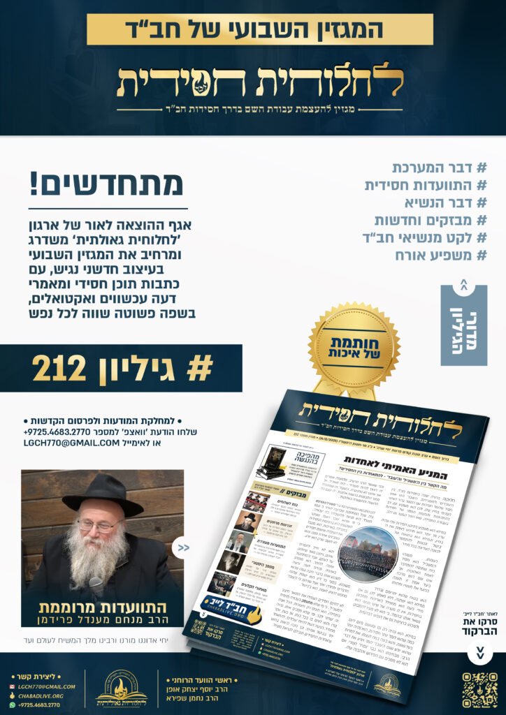 אגף ההוצאה לאור של ארגון 'לחלוחית גאולתית' שמח להגיש את מגזין 'לחלוחית חסידית' מספר 212, שנועד להעצים את עבודת השם בדרך חסידות חב"ד – בשפה פשוטה, שווה לכל נפש. המגזין מופק בעיצוב מתקדם ונעים לקריאה, וכולל תוכן חסידי עשיר, מאמרי דעה אקטואליים, וכתבות מרתקות שמחברות את הקורא לעולם החסידות בצורה חיה ומרגשת • המגזין השבועי יוצא לאור במהדורה מיוחדת, לרגל 'כינוס השלוחים העולמי' בניו יורק • בין המדורים במגזין המחודש: דבר המערכת, דבר הנשיא, מבזקים וחדשות, לקט מנשיאי חב”ד, משפיע אורח • במרכז המגזין התוועדות חסידית מיוחדת עם הרב מנחם מענדל פרידמן – שליח הרבי באור יהודה • בפנים: המגזין זמין לקריאה ולהורדה, כולל מודעה לפרסום הגיליון • לכתבה המלאה