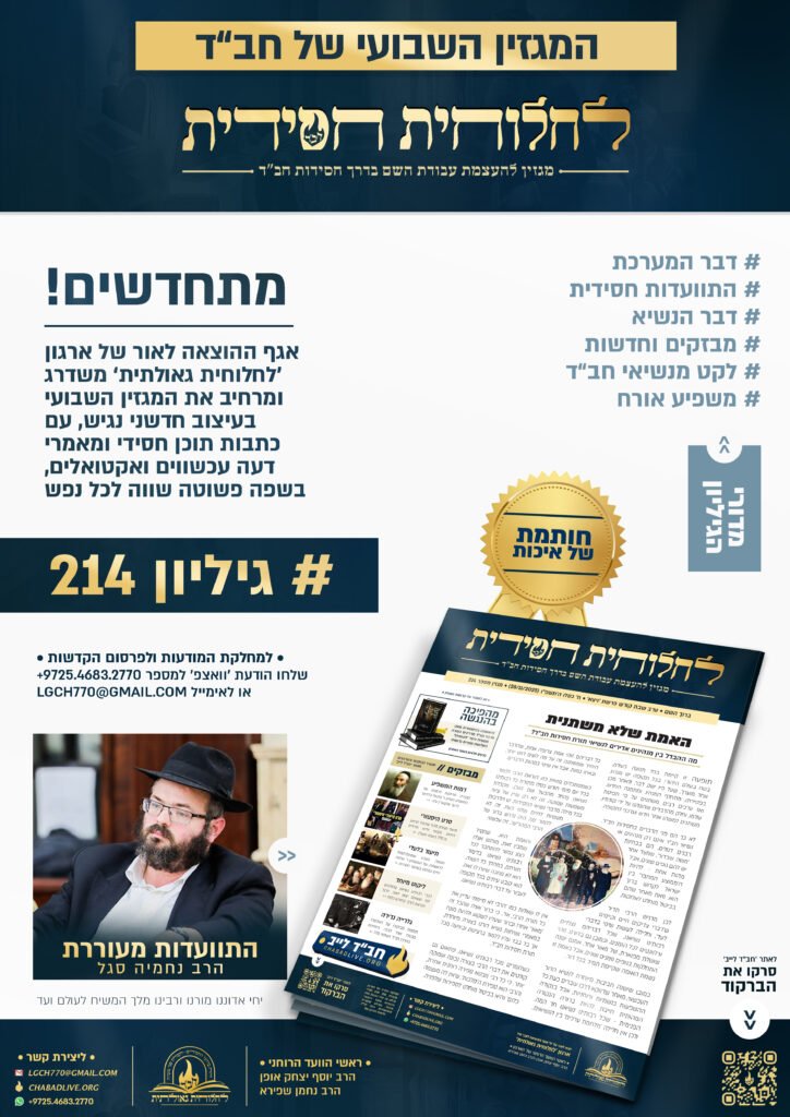 אגף ההוצאה לאור של ארגון 'לחלוחית גאולתית' שמח להגיש את מגזין 'לחלוחית חסידית' מספר 214, שנועד להעצים את עבודת השם בדרך חסידות חב"ד – בשפה פשוטה, שווה לכל נפש. המגזין מופק בעיצוב מתקדם ונעים לקריאה, וכולל תוכן חסידי עשיר, מאמרי דעה אקטואליים, וכתבות מרתקות שמחברות את הקורא לעולם החסידות בצורה חיה ומרגשת • בין המדורים במגזין: דבר המערכת, דבר הנשיא, מבזקים וחדשות, לקט מנשיאי חב”ד, משפיע אורח • במרכז המגזין התוועדות חסידית מיוחדת עם הרב נחמיה סגל – משפיע ישיבת 'תומכי תמימים ליובאוויטש' אור יהודה • בפנים: המגזין זמין לקריאה ולהורדה באיכות הדפסה, כולל מודעה לפרסום הגיליון • לכתבה המלאה