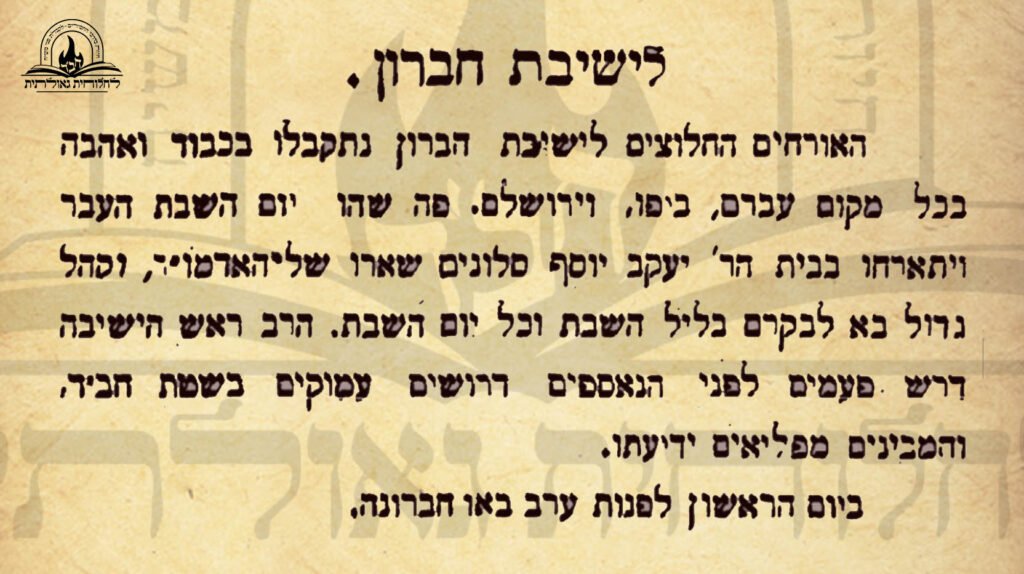 'לישיבת חברון. האורחים החלוצים לישיבת חברון נתקבלו בכבוד ואהבה בכל מקום עברם, ביפו, וירושלם. פה שהו יום השבת העבר ויתארחו בבית הר' יעקב יוסף סלונים שארו של האדמו"ר, וקהל גדול בא לבקרם בליל השבת וכל יום השבת. הרב ראש הישיבה דרש פעמים לפני הנאספים דרושים עמוקים בשטת חב"ד, והמבינים מפליאים ידיעתו. ביום הראשון לפנות ערב באו חברונה'.