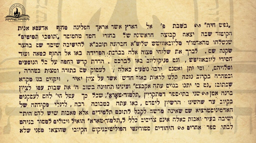 האדמו"ר מליבוביץ, זה האיש הגדול רב הפעלים, התופס מקו בחוג סביבתו בתור רוח החיה בכל אופני החיים היהודיים, כבר יסד זה מכבר ישיבה גדולה בליבוביץ, במטרה לתן מקום לצעירים בעלי כשרון שישתלמו בתורה והגיון עד־שיוכלו להופיע ולקבל משרות נכבדות של רבנות דיינות שוחטות ועוד. האדמו"ר הנכבד הזה מתענין מאז בגורל ישוב ארץ-הקדש ובהיות שגם אבותיו ראשי מיסדי שטת חב"ד נטו ביותר לעיר זו ויעריצו את ישובה, לכן שם עתה את פניו אליה לראשונה ליסד בה סניף לישיבתו בליובוביץ, מוסד שביכלתו להביא רוח־חיים בכל הישוב החברוני הדל, ולהרימו גם ברוח וגם בגשם.