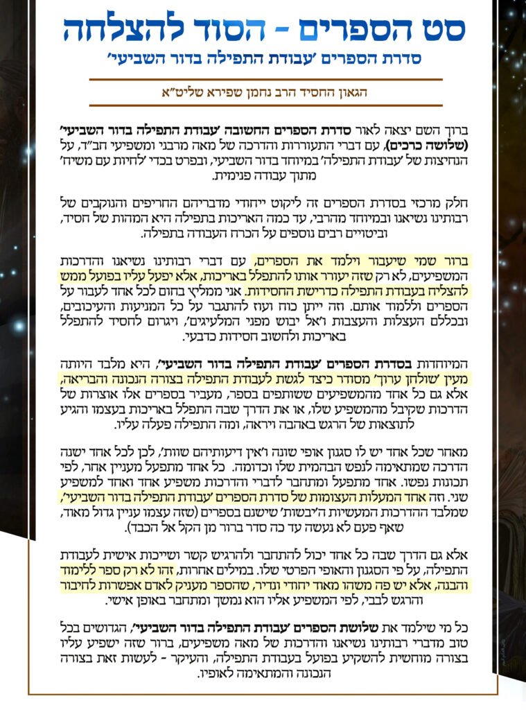 מכתב המלצה אישי מהרב נחמן שפירא – ה'חוזר' של הרבי וממשפיעי חב"ד הבולטים, חותם בקריאה נדירה על כך שכל אחד שיכניס לביתו וילמד את סדרת הספרים 'עבודת התפילה בדור השביעי' – יראה הצלחה מוחשית בתפילה בדרך החסידות • בדברים חמים וחדים הוא מדגיש כי הספרים הללו אינם רק ליקוט, אלא כלי מעשי שמסוגל לעורר, להדריך ולשנות בפועל את גישת החסיד לתפילה. סדרה שמחזירה את 'עבודת התפילה' למקום הטבעי שלה: בלב החיים החסידיים • לכתבה המלאה