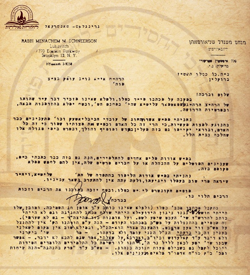 שלום וברכה! במענה על מכתבו מי"ד כסלו, ולפלא שאינו מזכיר דבר על דבר שהותו של הרב הצדיק הרב הגאון כו' מסאטמאר שליט"א שהיה במחנם הטהור, ובטח ימלא בהזדמנות הבאה, ובפרטיות הדרושה. נהניתי ממה שכתב אשר מהחוג של עובדי הביבליאטעק וכו' מתענינים כבר בהנוגע למצוות מעשיות, כי הרי זה כל האדם וכממו שכתוב 'ואת מצותיו שמור כי זה כל האדם', ובודאי ימצא גם בזה מעלין בקודש ומוסיף והולך, ובפרט בימי סגולה אלו שהלכה כבית הלל..