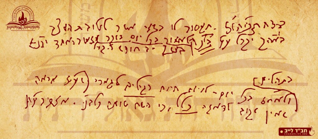 בדהתפוהמ"ז [=בדיקת התפילין והמזוזות]. תמסור לו בשמי אשר לטובת המצב באה"ק [= בארץ הקודש] יקבל ע"ע בל"נ [= על עצמו בלי נדר] במשך יב חודש הבע"ל [= הבאים עלינו לטובה] לאמור בכל יום בוקר מזמור האחד וק"נ בתהלים ולאח"ז [= ולאחרי זה] בכל יום – לחיות חיים רגילים לגמרי (שעי"ז [= שעל ידי זה] מראה שאין מקום לדאגה כלל, כי השם שומר כל בנ"י [= בני ישראל]. אזכיר עה"צ [= על הציון].