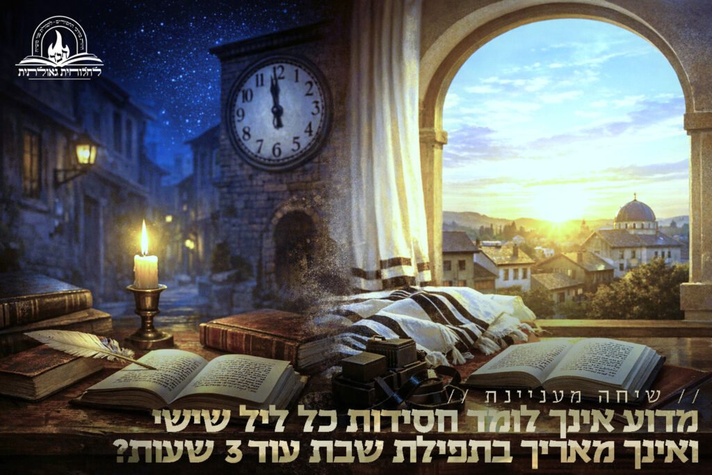 אנו מגישים קטע מיוחד משיחה מרתקת של הרבי, המתארת את תביעתו החריפה של הרבי הריי"צ להגיע לתכלית השלימות • מצד אחד – דרישה ברורה: להיות ערים וללמוד חסידות כל ליל שישי, ולהתפלל בשבת באריכות של שלוש שעות נוספות, מתוך אהבה, יראה ודביקות. ומצד שני – שהדביקות לא תישאר 'ברוח', אלא תחדור אל המציאות עצמה: אל האכילה, השתייה, וההתנהגות הגשמית של החסיד • וכך מגיעה הקריאה החדה שמטלטלת גם היום: 'תובעים ממנו – מדוע אינו יושב ללמוד בליל שישי כל הלילה, ומדוע אינו מתפלל שחרית בשבת ג' שעות יותר מכפי שהתפלל בפועל'?.. • לשיחה המלאה