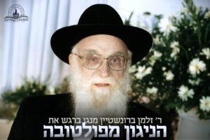 תיעוד מרגש מהתוועדות בכפר חב"ד, בו נראה החזן וה'בעל מנגן' החסידי ר' זלמן ברונשטיין ע"ה מנגן את הניגון מפולטובה בעומק, ברגש חסידי טהור ובדביקות שובה לב